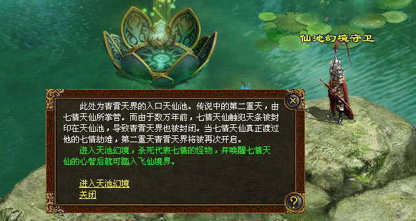在天仙池中需接受成为天仙的必要磨练!七种不同的妖兽代表了“喜,怒,哀,乐,爱,恶,欲”这七情,妖兽会依次跃下莲花座对你进行考验。 |